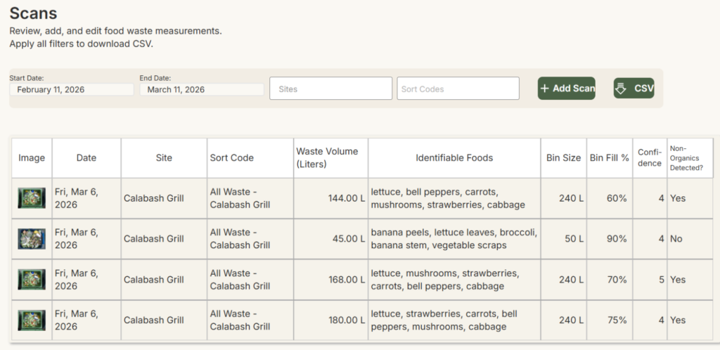 Historic insights: Food waste data is automatically segmented based on the QR code staff use to access the tool. Bin photos and data are saved and editable for ongoing review.